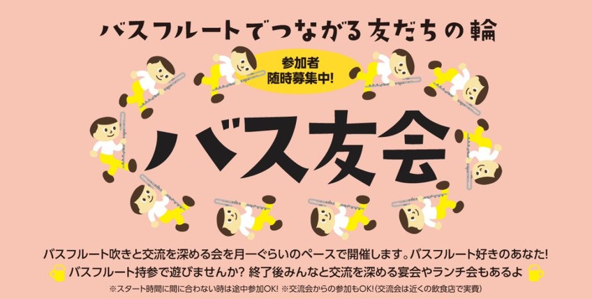 バスフルートでつながる友だちの輪 バスフルート吹きと交流を深める会を月1回ペースで開催!バスフルート好きのあなた!バスフルート持参で遊びませんか?終了後みんなと交流を深める宴会やランチ会もあるよ ※スタート時間に間に合わない時は途中参加OK!...